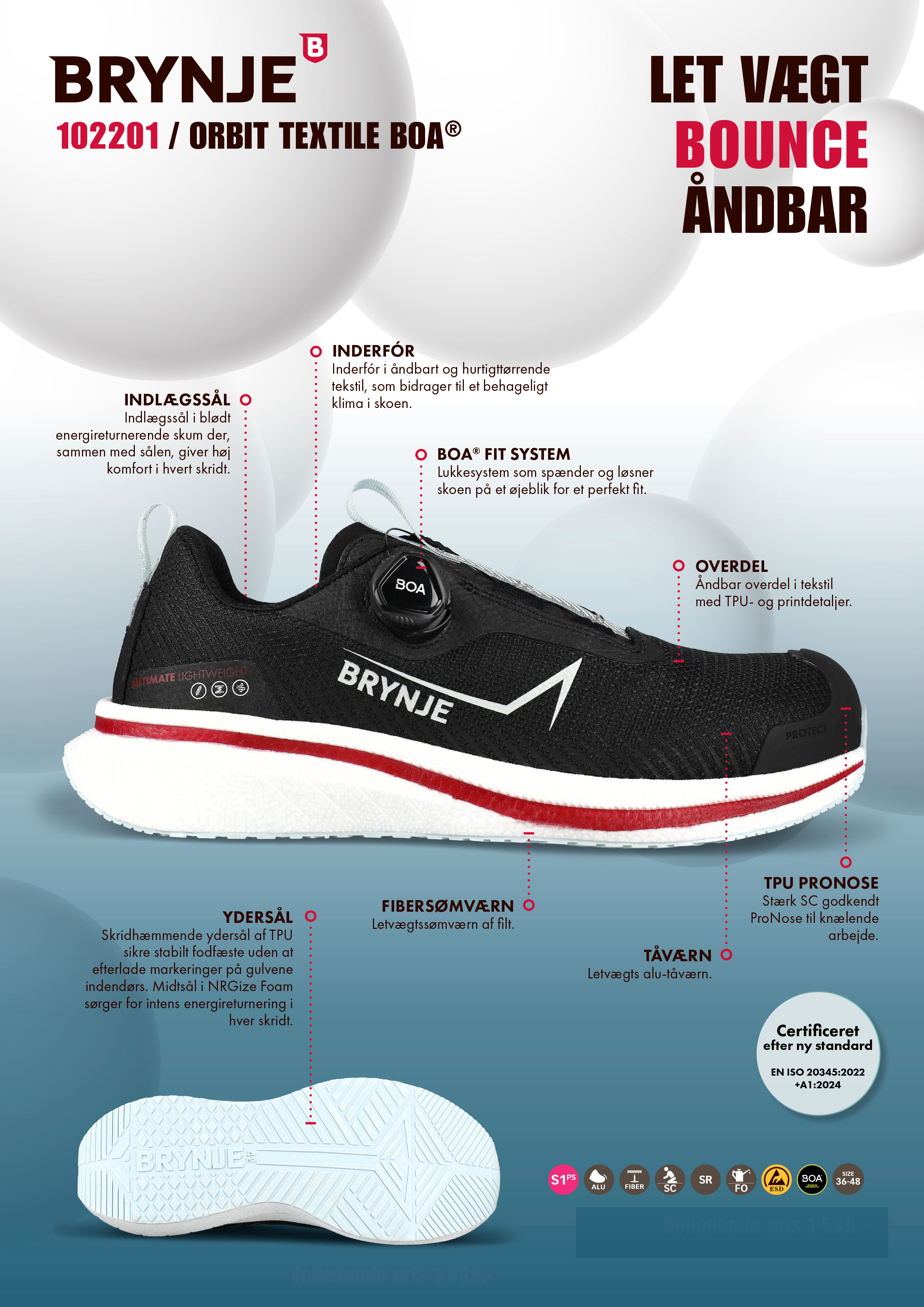 Brynje Orbit Textile Boa sikkerhedssko er fremstillet i åndbart tekstil, som sammen med det ventilerende inderfoer sikrer et behageligt og frisk klima i skoen – hele dagen. Den skridhæmmende TPU-ydersål giver et stabilt fodfæste og efterlader ingen mærker på indendørs gulve.