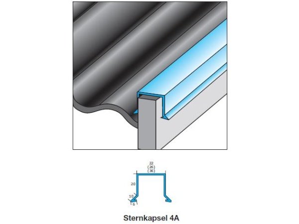 Icopal sternkapsel alu 26 mm 4A-27 er en sternkapsel, der anvendes til beskyttelse af sternbrædder og lignende. Fastgørelse sker med 1"/25mm alusøm med tætningsskiver og profilerne samles ved at skubbe stykkerne ind i hinanden med et overlæg på 40mm.