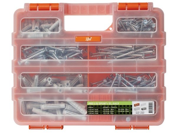 Kombineret sortimentskasse med elforzinket SPUN® skruer og dybler til indendørs brug. Anvend skruerne og dyblerne i køkken, bad, til ophæng af reoler og elinstallationer.