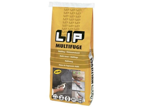 Lip Multifuge grå 20 kg er en cementbaseret universalfugemasse, der er velegnet til fugning af keramiske fliser, plader, klinker, spaltklinker, glasbyggesten med mere, hvor fugebredden er mellem 2 og ca. 20 mm. Lip multifuge kan anvendes inden- og udendørs samt i vedvarende våde områder. Skal der fuges på bevægeligt underlag, tilsættes Lip multibinder, der forøger fugens elasticitet.