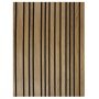 Woody & Moody akustikpanel random 600x2400 mm eg mat lak med sort poyesterpanel leveres som et komplet panel med egelameller, der er klar til montering på enten loft eller væg. Akustikpanelernes design udgøres af lameller i varierende bredde med finér af træ og en bagvedliggende polyesterplade med akustikdæmpende egenskaber. Træet giver et naturligt udtryk, der bryder hvide overflader og bidrager med varme til boligen. Den bagvedliggende sorte akustikplade (læs: polyesterplade) har en lyddæmpende effekt og giver et behageligt indeklima med mindre rumklang. Akustikpanelerne består af naturligt træfinér på MDF-lameller, der har en bredde på henholdsvis 20 mm, 32 mm og 51 mm med en afstand på 14 mm mellem hver lamel. Lamellerne er lakerede med mat lak, således at produktet ikke skal efterbehandles eller vedligeholdes. Bag lamellerne ses den bagvedliggende sorte polyesterplade. Akustikpanelet har en samlet dimension på 600x2400x21 mm, og det er muligt at save panelet til. For at opnå bedst mulig akustik i rummet anbefales det at montere 9-45 mm isolering bag akustikpanelet.