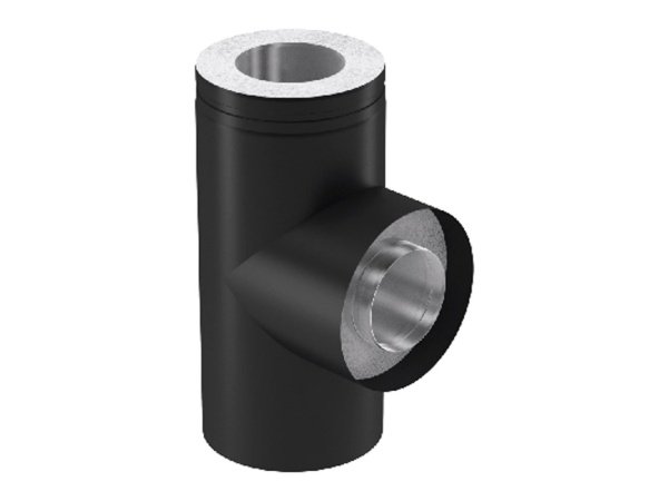 Schiedel isoleret T-stykke med udvendig diameter Ø250 mm med sort finish. T-stykket er designet til bagudmontering for fleksibel tilslutning af rør.