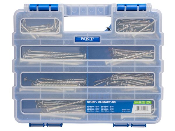 NKT Fasteners sortimentskasse Spun + CLIMATE® skruer til udendørs brug. Anvend skruerne til træ, plast, dybler, fibergips og beslag med undersænkede huller.