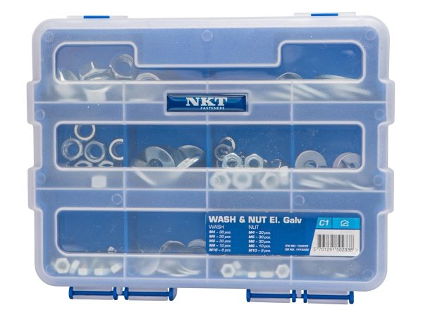 NKT Fasteners sortimentskasse med elforzinket skærmskiver og møtrikker til indendørs brug. Anvend skiverne og møtrikker sammen med bolte, maskinskruer eller gevindstænger.