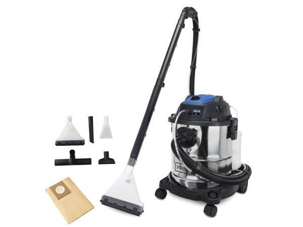 Scheppach SprayVac 20 er en alsidig tæpperenser, der effektivt rengør gulvtæpper, polstrede møbler og bilsæder. Med sin 5-i-1 funktion fungerer den også som en kraftfuld våd- og tørstøvsuger. Den er udstyret med en praktisk sprøjte- og sugeslange, der sikrer en grundig rengøring samt hurtig tørring af overflader.