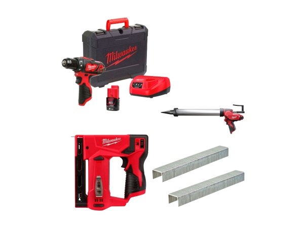 Milwaukee kombokit består af bore-/skruemaskine M12 BDD-201c, batterier, lader, kuffert, klammepistol, fugepistol og klammer.