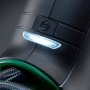 Et oplyst manometer viser trykmålinger tydeligt, hvilket er praktisk under svage lysforhold. Når arbejdet er færdigt, kan tilbehør og slange opbevares direkte foran på værktøjet.