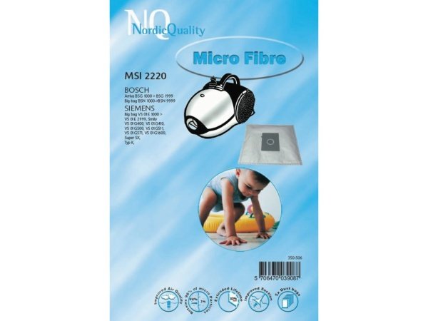 Nordic Quality støvsugerposer MSI 2220. Poserne er lavet af microfiber og passer fx til Bosch BSN Serie og Siemens Smily og Type K. Pakken indeholder 5 stk. støvsugerposer.