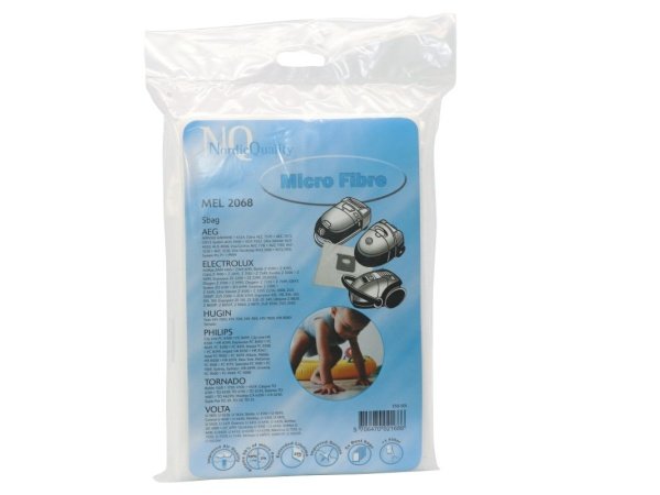 Nordic Quality støvsugerposer MEL 2068. Støvsugerposerne er lavet af microfiber, og pakken indeholder 5 stk. poser samt 1 stk. filter. Poserne passer til: AEG, Electrolux, Hugin, Volta og Philips.