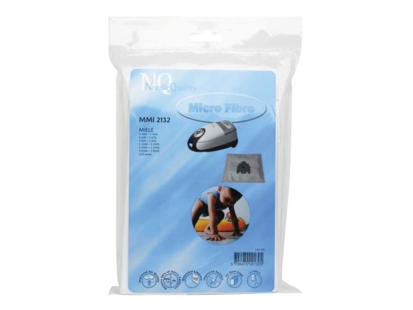 Nordic Quality støvsugerposer MMI 2132. Støvsugerposerne er lavet i microfiber og passer blandt andet til Miele S 5000 Serie, S400i Serie, S600i serie og S800 Serie. Pakken indeholder 5 stk. støvsugerposer og 2 stk. filtre.