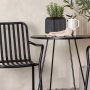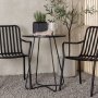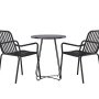 Venture Bacong cafesæt Ø60 m/2 stole og rund bordplade med smalle ben i sort stål er perfekt til udestuen, terrassen eller altanen. Cafébordet kombineres med to stole fra Peking-serien med et ribbet udseende og sort farve. Stolene er fremstillet i aluminium, så de er lette at flytte og-/eller stable, mens de samtidig har integrerede armlæn.