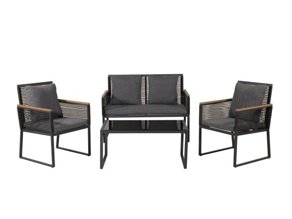 Venture Design loungesæt Dallas er et lækkert loungesæt, der består af sofa, sofabord og 2 havestole i kvalitets materialer. Sættet leveres inklusiv hynder, så du altid kommer til at sidde behageligt. Sættet er fremstillet i sort lakeret aluminium med armlæn af teak. Sofabordet har en bordplade af spraymalet glas.