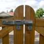 Plus lågebeslag 2436-1 i varmgalvaniseret stål til dobbeltlåge. Beslagene sikrer lang holdbarhed og optimal funktion til havelågen.