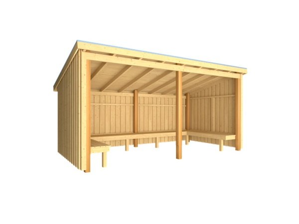 Plus Nordic Bålhytte 9,5 m2 Type 1B i ubehandlet nåletræ med tre lukkede sider og indbygget bænk, hvor du kan samle familie og venner.