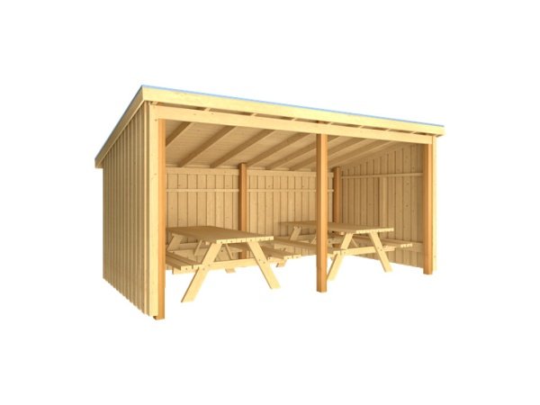 Plus Nordic Madpakkehus på 9,5 m2 Type 1B. Er i ubehandlet nåletræ med tre lukkede samt to flytbare bænke, hvor alle kan samles om madpakkerne.