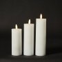 Dacore LED bloklys med realistisk væge. LED-lysene er hvide med flad top og diameteren er 5 cm. Højden på lysene er 10, 15 og 17,5 cm. Lysene er inklusiv fjernbetjening med timer.