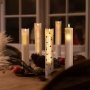 Sirius Sara LED-kalenderlys med bevægelig flamme. Lyset er hvidt og er 29 cm højt og 5 cm i diameter. Tal og dekoration på dette lys er i guld. Du kan også få lyset med sølvdekoration. Kalenderlyset anvender 2 stk. AA batterier (medfølger ikke).