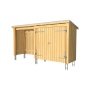 Plus Nordic Multi 2 havehus 432x109x191/218 cm med dobbeltdør er et alsidigt skur, der kan anvendes til alle formål som f.eks. cykelskur, brændeskur, opbevaringsskur og meget mere. Plus Nordic Multi havehus leveres som "saml-selv" i ubehandlet træ, og det anbefales, at du behandler træet før opsætning. Plus Nordic Multi havehus leveres inklusiv tagpap, alulister og H-stolpefødder.