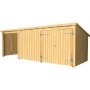 Plus Nordic Multi 3 havehus 635x218x167x218 cm med dobbeltdør samt én lukket og én åben front. Det store Plus Nordic Multihus 3 giver dig utroligt mange anvendelsesmuligheder som f.eks. cykelskur, brændeskur, opbevaringsskur og meget mere. Plus Nordic Multi havehus leveres som "saml-selv" i ubehandlet træ, og det anbefales, at du behandler træet før opsætning.