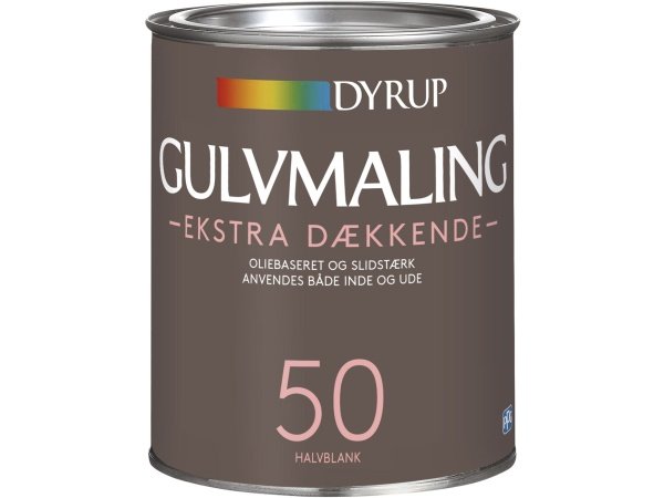 Dyrup Gulvmaling Ekstra Dækkende Olie 50 alkydmaling til træ- og betongulve. Malingen giver et meget slidstærkt og vaskbart gulv med en hård halvblank overflade. Malingen er nem at arbejde med og tørrer meget hurtigt. Malingen er derudover vandresistent og smudsafvisende.