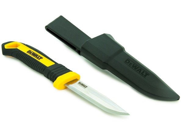 Dewalt håndværkerkniv med 90 mm rustfrit stålblad til alle slags formål. Det gummistøbte greb sikrer komfort og sikkerhed og der medfølger en plastopbevaringsskede til opbevaring og sikkerhed.