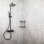 Geyser trådhylde dobbelt sort til hjørne er en opbevaringskurv, der monteres i brusekabinen til opbevaring af shampoo med mere. Trådhylden leveres inklusiv skruer til montering i væggen.