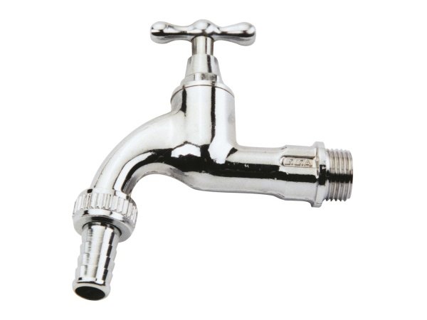 Aftapventil 3/4" 116 er en forkromet aftaphane med T-greb og indbygget kontraventil og slangeforskruning.